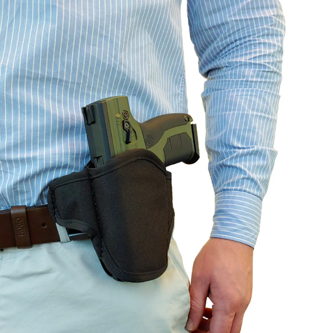 Naše nylonové opaskové pouzdro Byrna má lehký, minimalistický design, který umožňuje pohodlné celodenní oboustranné nošení uvnitř opasku (IWB) nebo vně opasku (OWB). Štíhlý a jednoduchý profil v kombinaci se spodní částí s otevřenou hlavicí poskytuje dostatek prostoru pro snadné tasení a bezpečné držení. Lze ji použít i pro skryté nošení uvnitř oděvu.