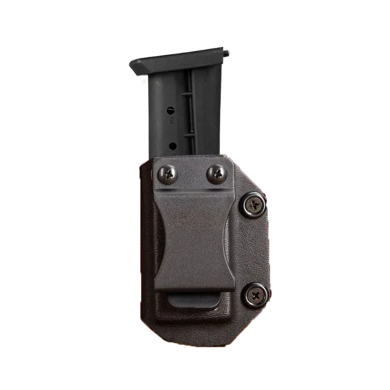 Il portacaricatore Byrna è completamente regolabile e consente di tenere il caricatore Byrna di riserva in vita o in tasca. Può essere indossato all'interno o all'esterno della cintura con ritenzione regolabile. Tutti i bordi sono lisci e lucidati.